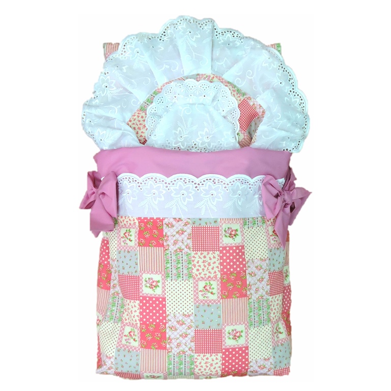 Комплект в стиле <<пейчворк>>, украшенный очень красивым хлопковым кружевом: