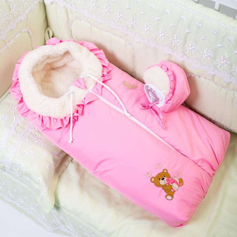 1. Конверт прогулочный на молнии, с вышитым милашкой-мишкой. Материал верха - плащевка, подклад - натуральный мех, утеплен синтепоном. Капюшон с кулисой на фиксаторах.