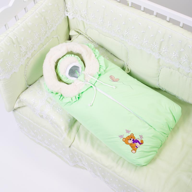 1. Конверт прогулочный на молнии, с вышитым милашкой-мишкой. Материал верха - плащевка, подклад - натуральный мех, утеплен синтепоном. Капюшон с кулисой на фиксаторах.